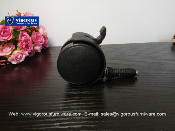 This black plastic twin wheel casters place more wheel surface on the floor and carpet pile, and move in opposite directions to minimize carpet fiber twisting.